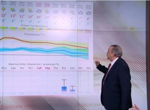 Общо взето времето е хубаво и ще се радваме на една топла зима“, обяви той. Проф. Рачев го похвали, като добави, че без да гледа картата той е усетил нещата. Проф. Рачев сподели още, че избрал професията си от малък, защото си е мислил, че е по-шарена. Той направи и кратка прогноза за следващите месеци, като обясни, че зимата ще се показва, но по малко.
